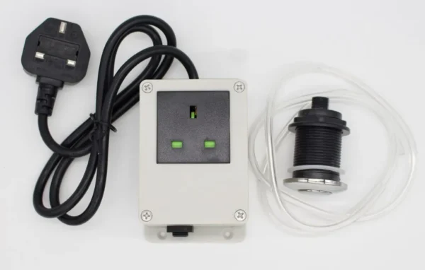 The most popular way to control a continuous feed waste disposal unit when there’s no wall switch nearby. The countertop button uses air pressure rather than electricity – completely safe next to the sink. Press the button, it sends a pulse of air through tubing to the relay box, which switches your unit on or off.